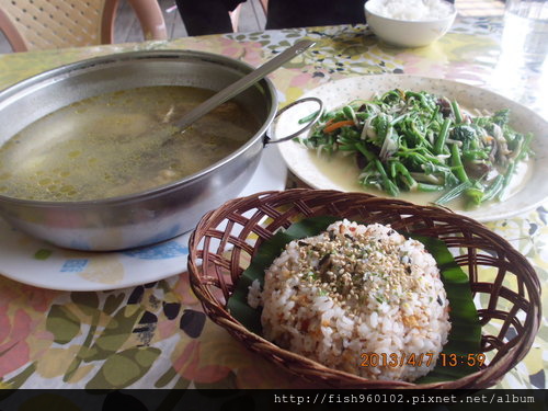 我們點了龍鬚菜,鮭魚拌飯,烤香魚,烤山豬肉及馬告雞湯,總計600元